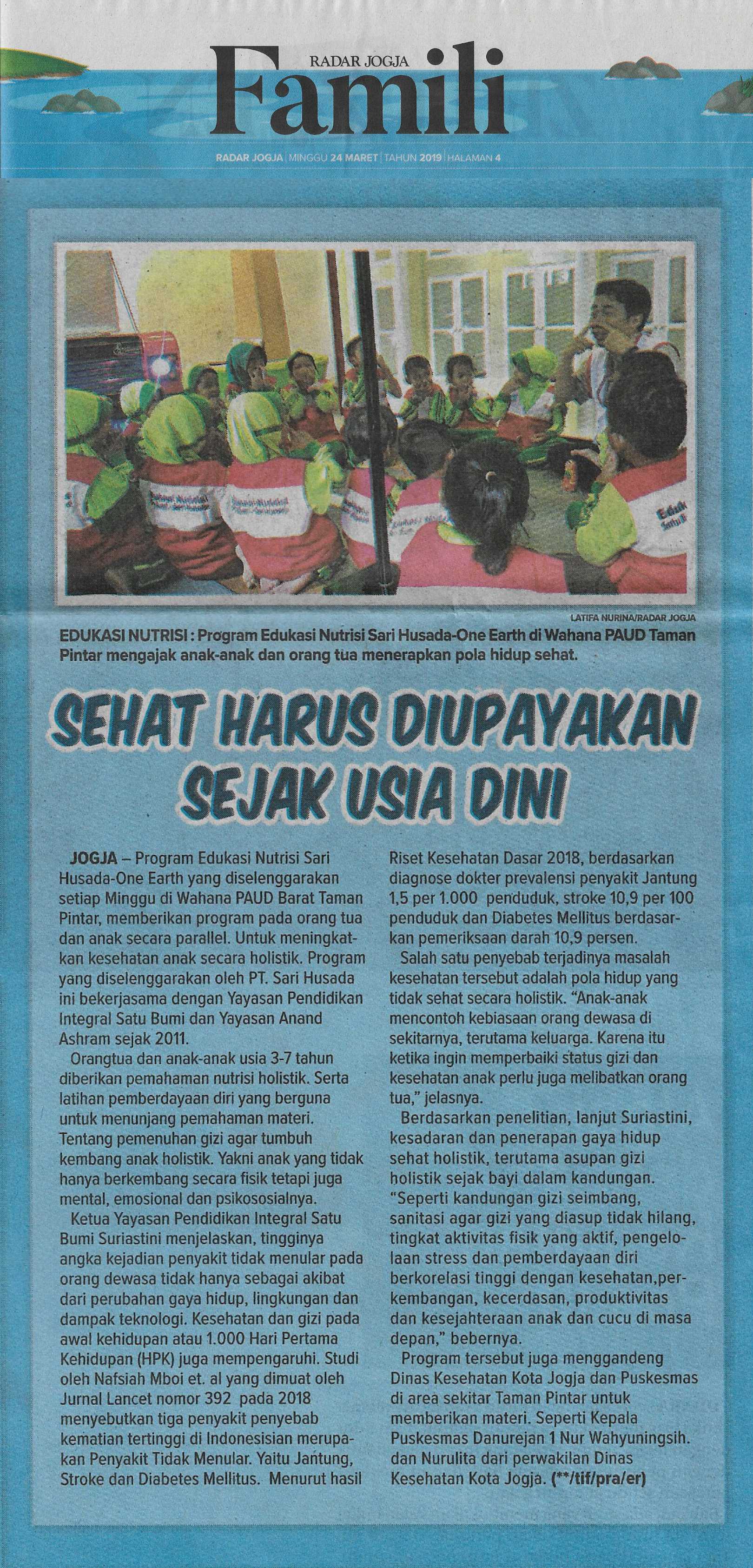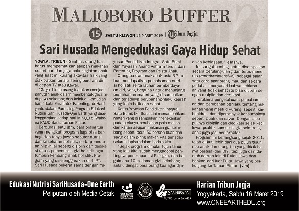 Dalam melaksanakan program ini, didukung SariHusada, One Earth Integral Education Foundation bekerjasama dengan Anand Ashram Foundation, menggelas program Edukasi Nutrisi SariHusada One Earth yang dilakukan setiap Minggu di Taman Pintar Yogyakarta. “Program ini hadir untuk menumbuhkan kesadaran akan kebutuhan nutrisi anak dan tumbuh kembang anak secara holistik. Program ini sudah dimulai sejak Oktober 2011,” jelas Direktur Yayasan Pendidikan Integral Satu Bumi Dr. N.W. Suriastini M.Phil, Minggu (20/1).
