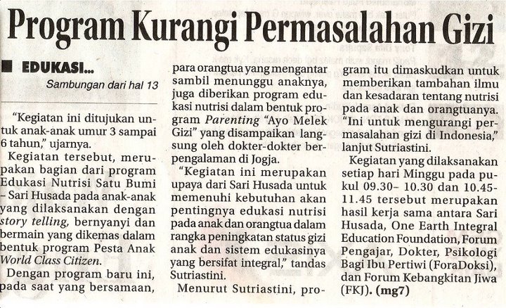 Menurut Suriastini, program itu dimaksudkan untuk memberikan tambahan ilmu dan kesadaran tentang nutrisi pada anak dan orangtuanya. “Ini untuk mengurangi permasalahan gizi di Indonesia,” lanjut Suriastini. Kegiatan yang dilaksanakan setiap hari Minggu pada pukul 09.30 – 10.30 dan 10.45 – 11.45 tersebut merupakan hasil kerjasama antara Sari Husada, One Earth Integral Education Foundation, Forum Pengajar, Dokter, Psikolog Bagi Ibu Pertiwi (ForaDoksi), dan Forum kebangkitan Jiwa (FKJ).